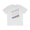Ce produit présente une coupe droite légèrement oversize, avec un col rond et des manches courtes pour un porté confortable au quotidien. On retrouve l’inscription « Bisous » brodée sur la poitrine, déclinée trois fois avec un motif vichy dans trois coloris différents : rose, bleu clair et bleu marine. Le visuel est repris dans un format plus large au dos, apportant une identité graphique forte et ludique, fidèle à l’univers de la marque.